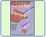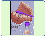 Move the brush across the teeth using a small circular motion. Continue with this motion cleaning one tooth at a time. Keep the tips of the bristles against the gum line. Avoid pressing so hard that the bristles lie flat against the teeth. (Only the tips of the toothbrush clean the teeth.) Let the bristles reach into spaces between teeth.